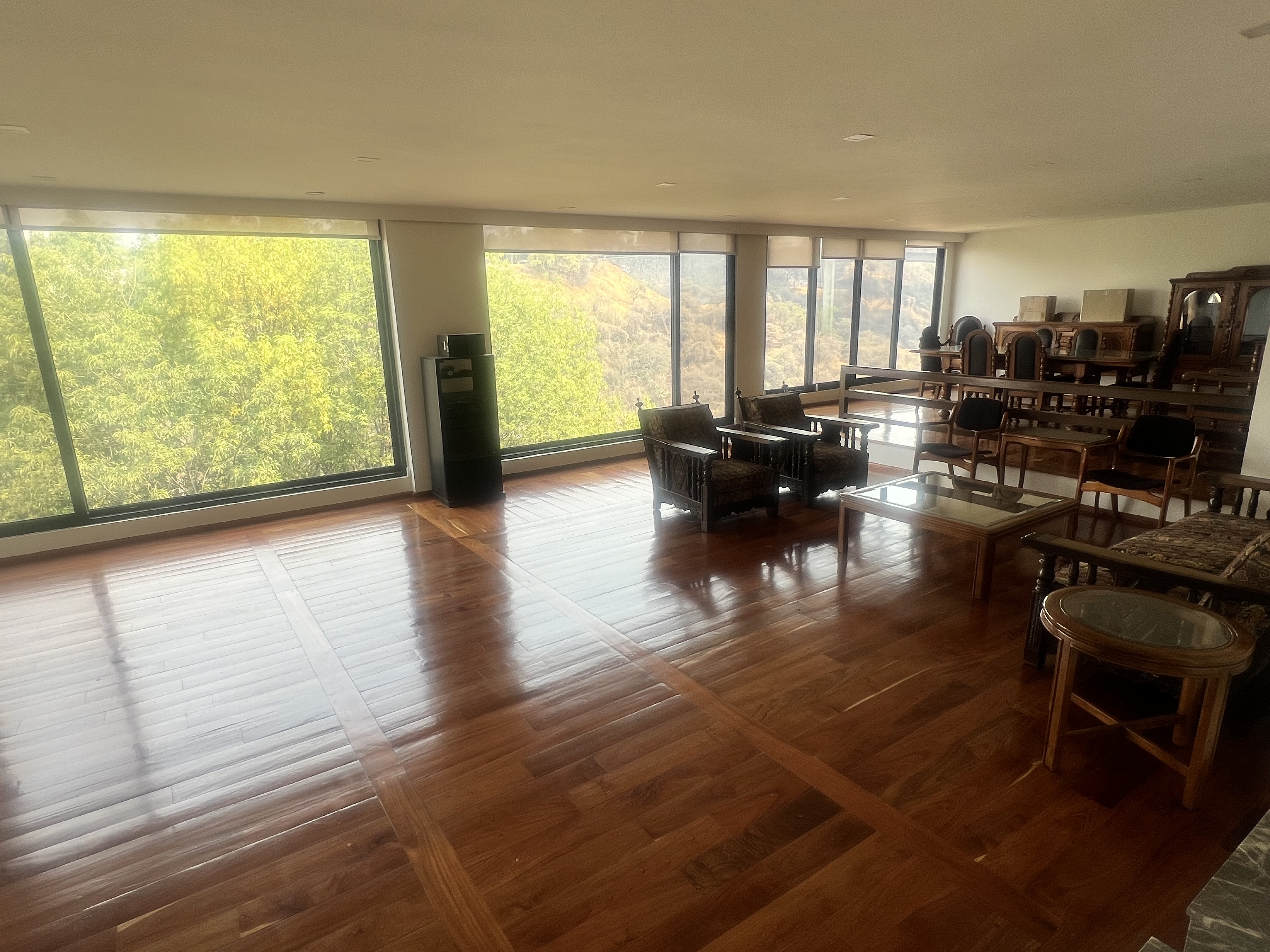 Amplia sala y comedor con ventanales que logran dar mayor amplitud y excelente iluminacion natural teniendo una vista arbolada.