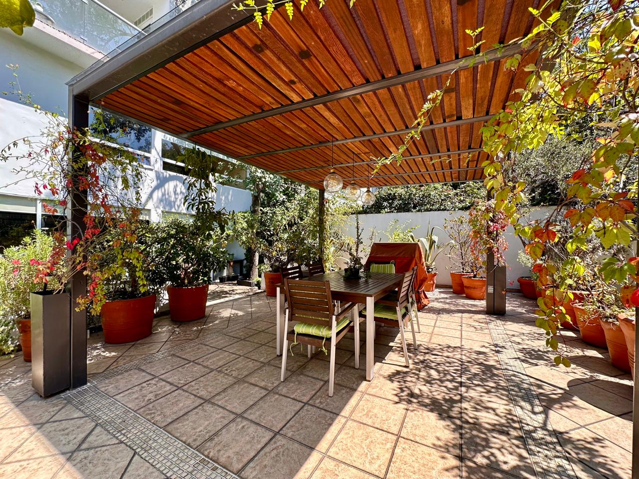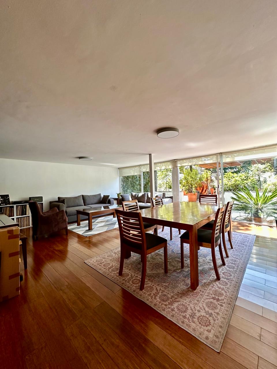 Estancia Sala comedor con pisos de madera, luz natural y salida a una hermosa terraza de 50 m2 aproximadamente, con pérgola, espacio para asador y una linda vista arbolada, donde podrás recibir a tus familiares y amigos.