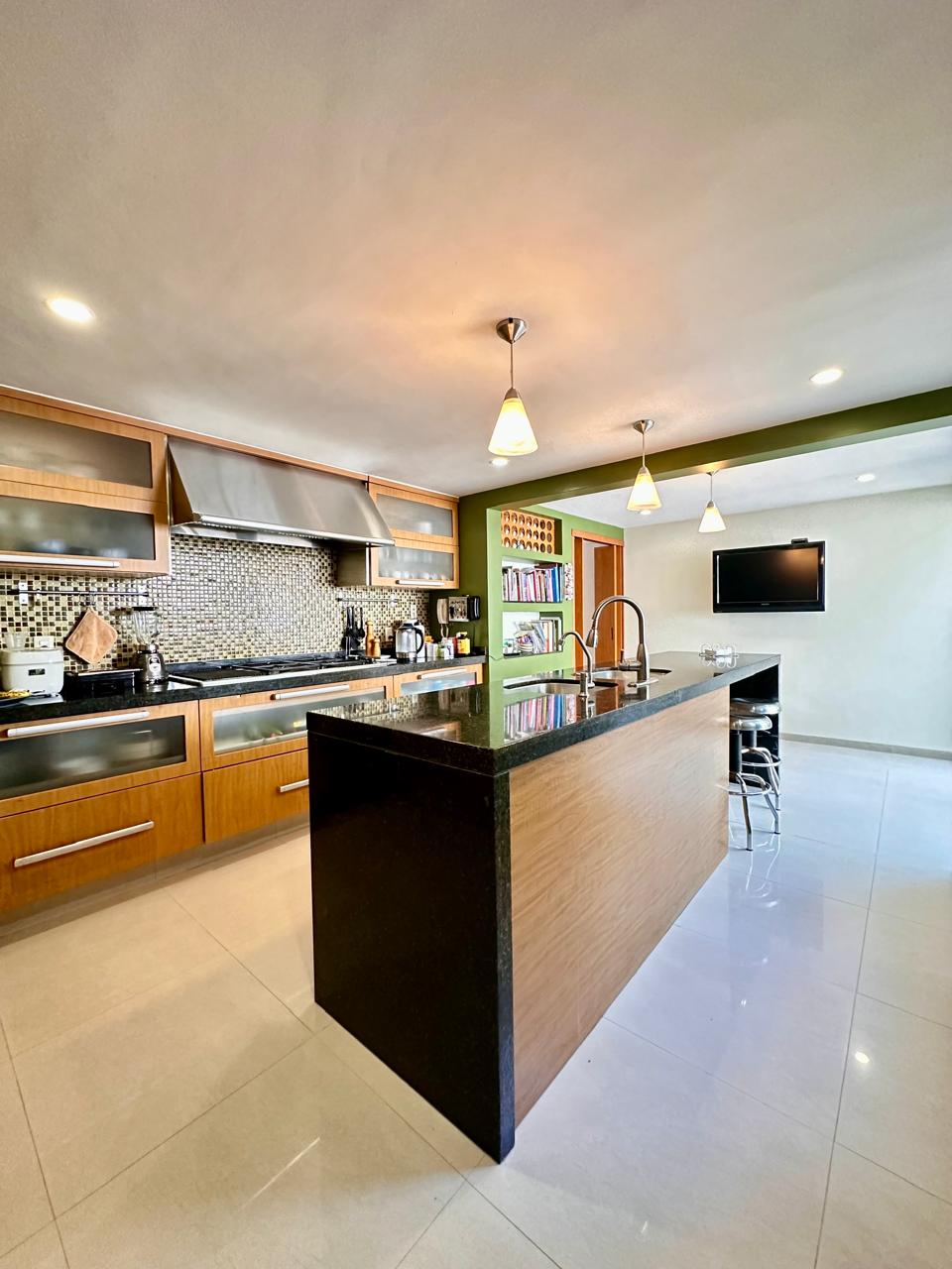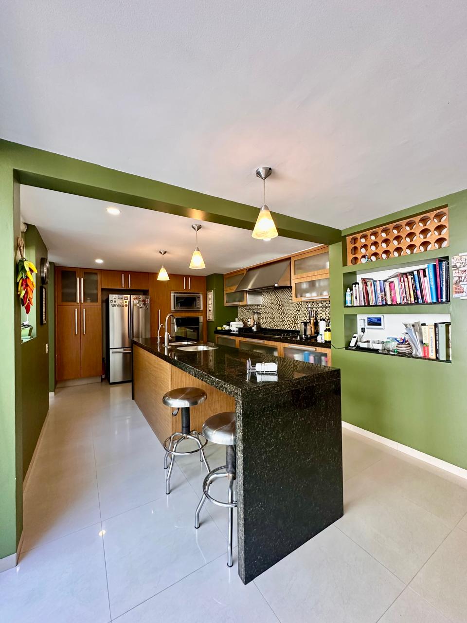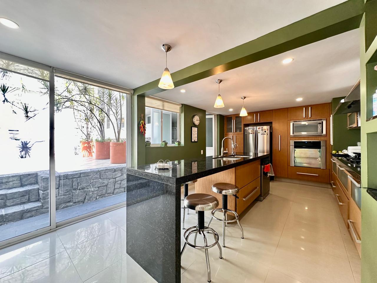 Cocina amplia con barra de granito, espacio con desayunador integrado y salida a otra terraza muy disfrutable.