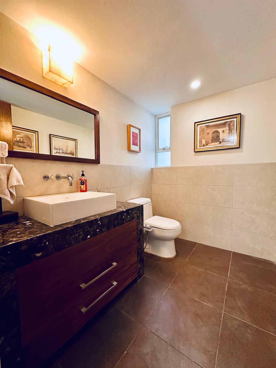 3 recámaras. La recámara principal con baño con tina y gran vestidor. Las recámaras secundarias comparten baño.