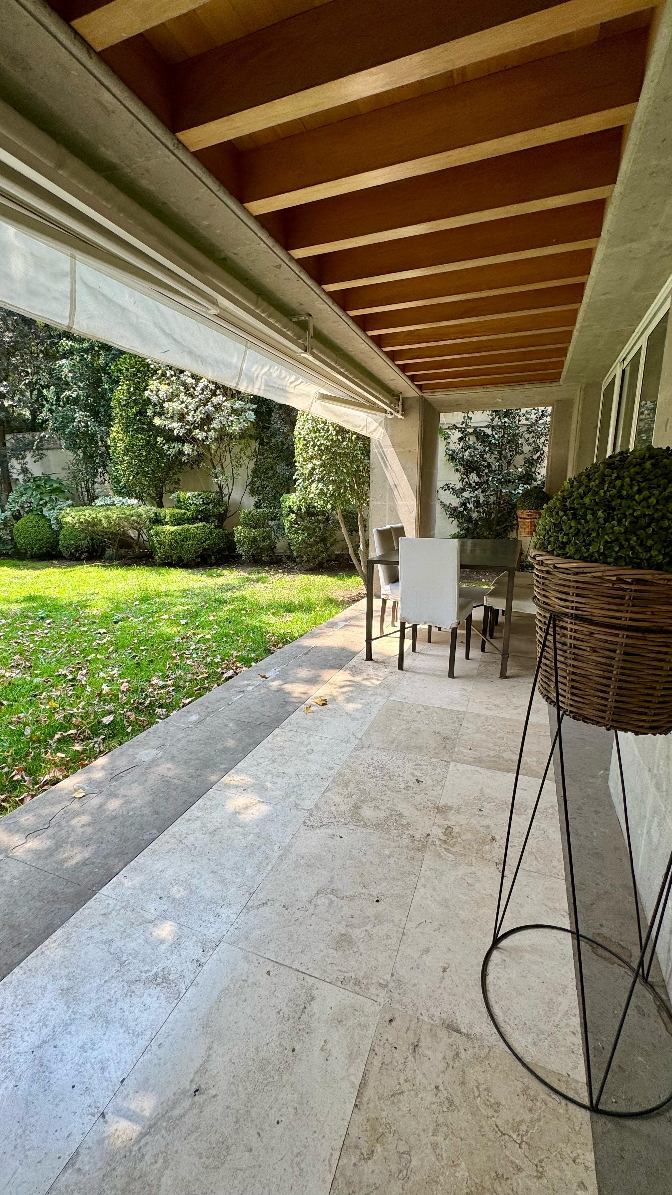 Una hermosa terraza que rodea la casa y que aporta una increíble vista e iluminación a toda la casa y que además podrás disfrutar del sonido relajante de la caída de agua de la fuente.