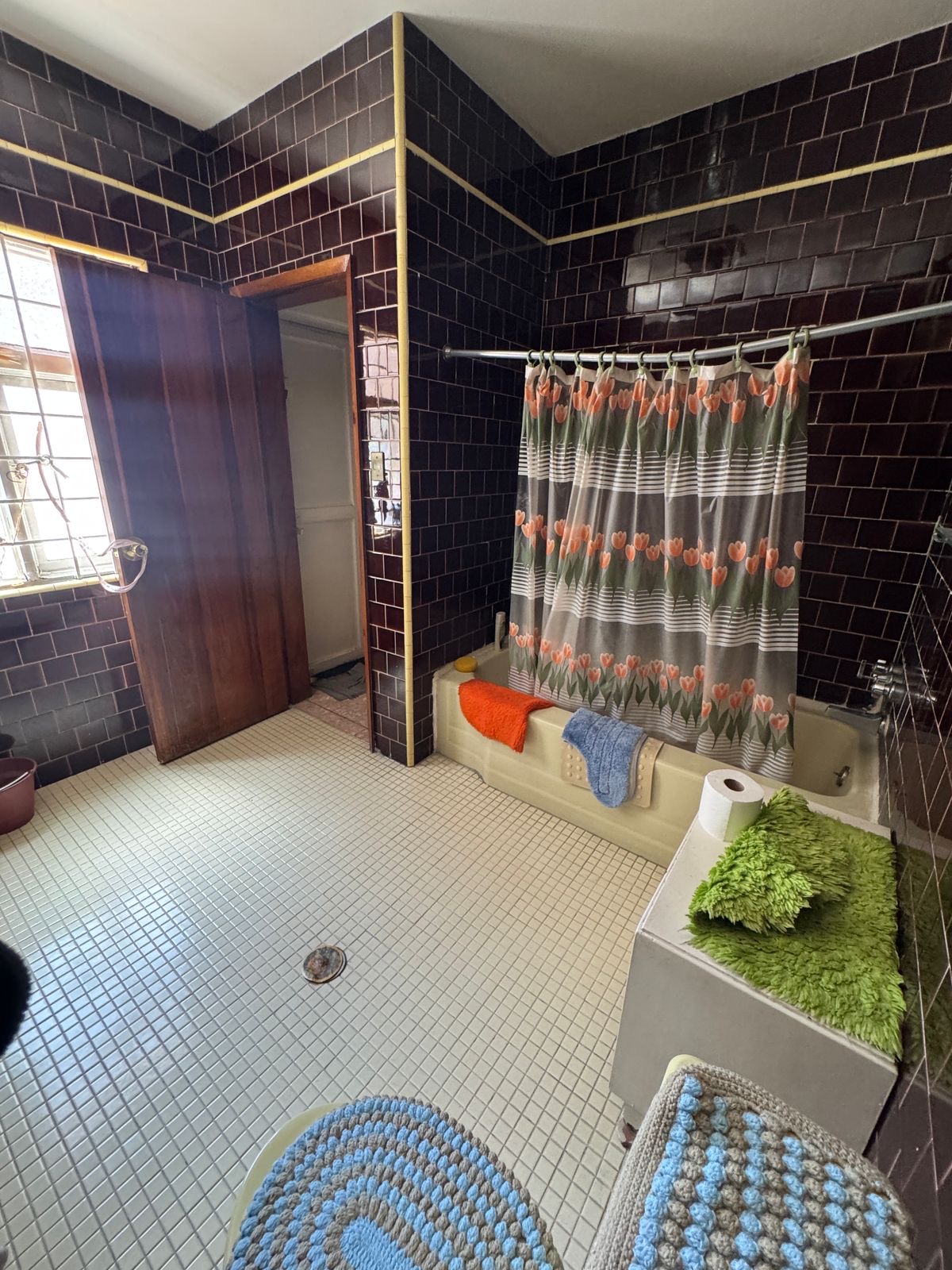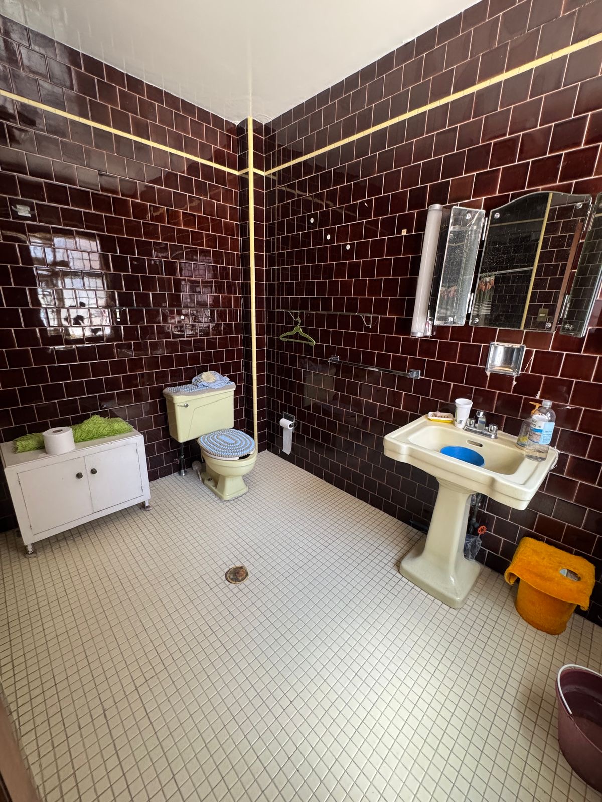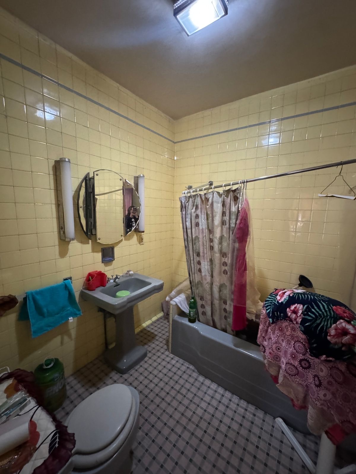 Una habitación con baño completo y clóset.