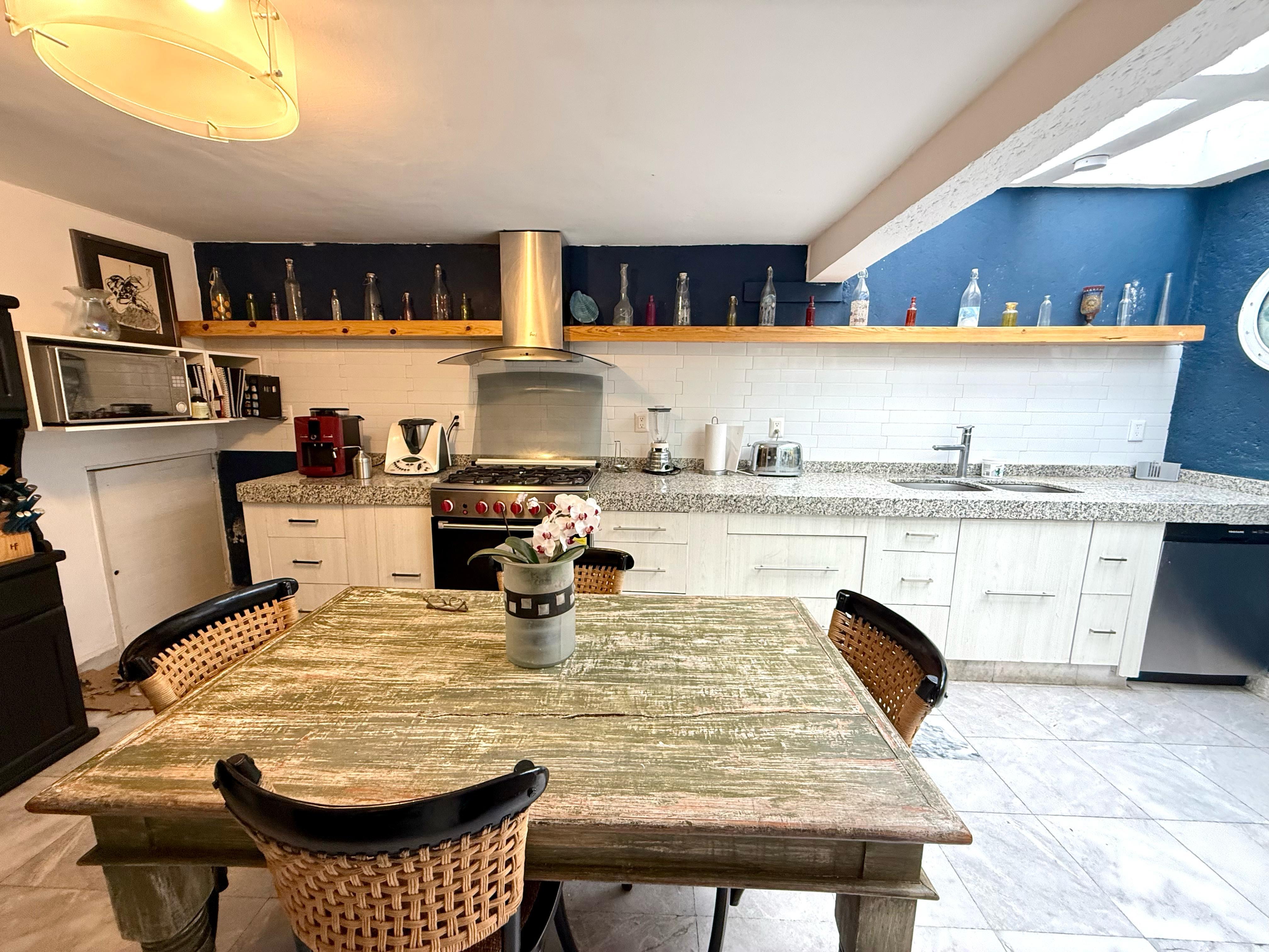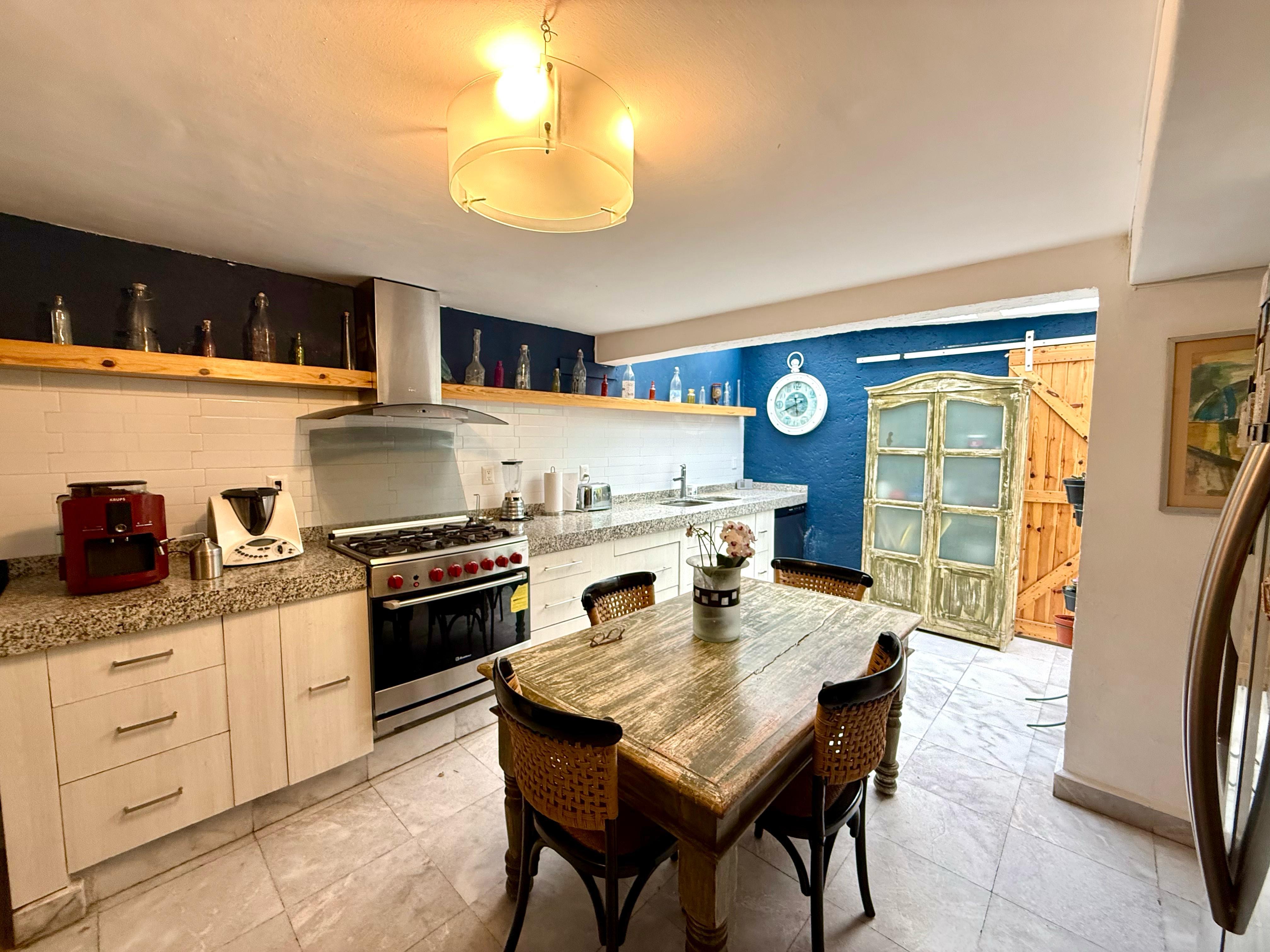 Cocina equipada con una inmensa barra de granito de 5 metros, y demasiados espacios de almacenamiento, con salida a una terraza en la que podrás disfrutar de momentos al aire libre con tu familia y amigos.