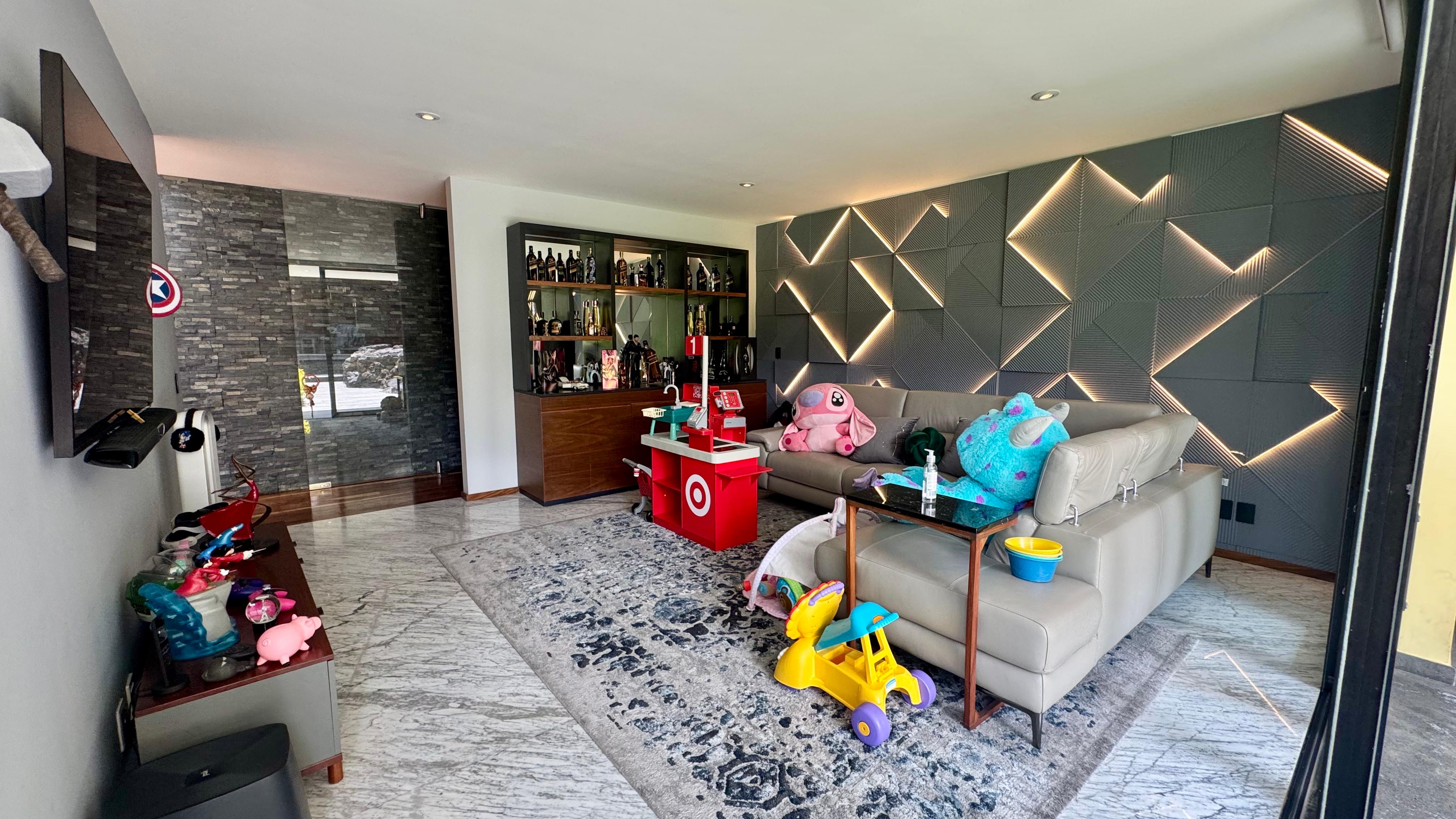Family room con bar de gran tamaño con salida a terraza.
