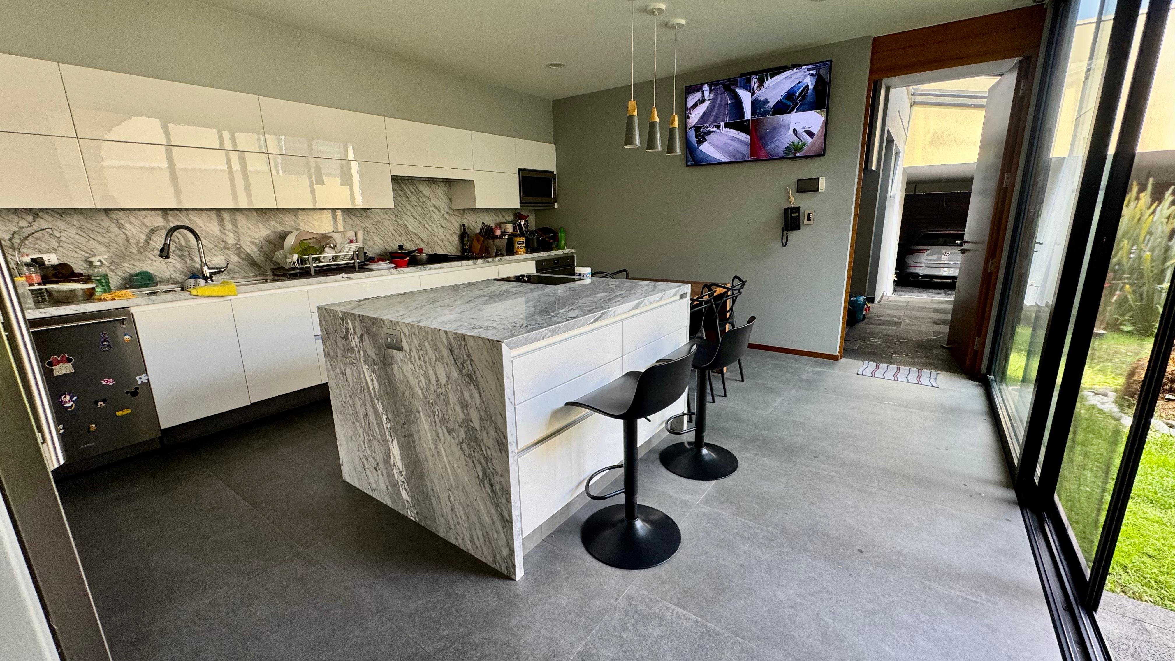Cocina de mazu con cubiertas de granito negro flameado, con isla totalmente equipada con parrilla, campana, lavaplatos, horno de gas, horno de microondas, cafetera, dos conjuntos de refrigerador y congelador toso de la marca SMEG, además de contar con un cuarto de despensa y salida independiente al área de servicio.