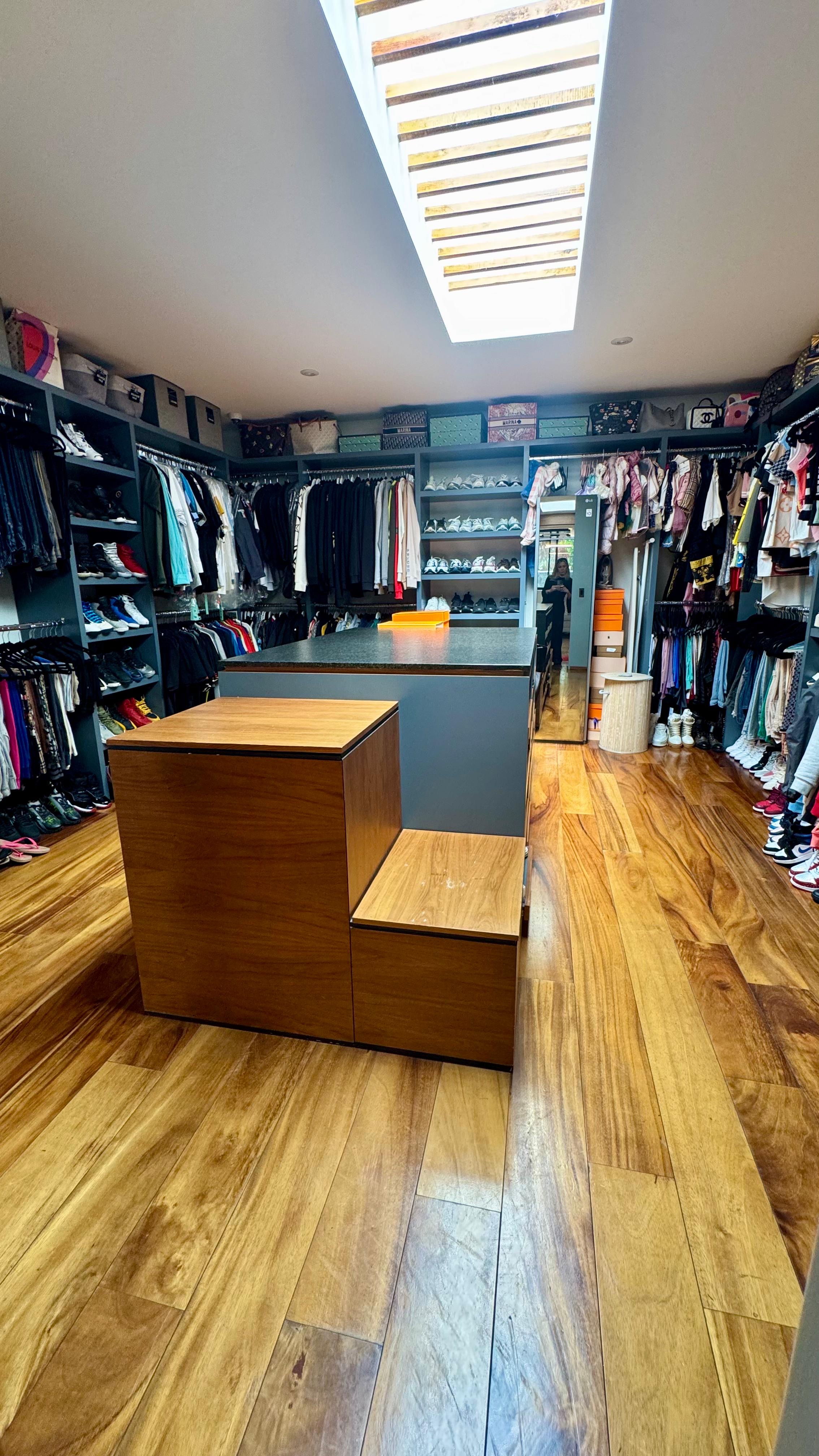 Recámara principal con vista al jardín, baño con doble lavabo, vestidor de gran tamaño con isla al centro.