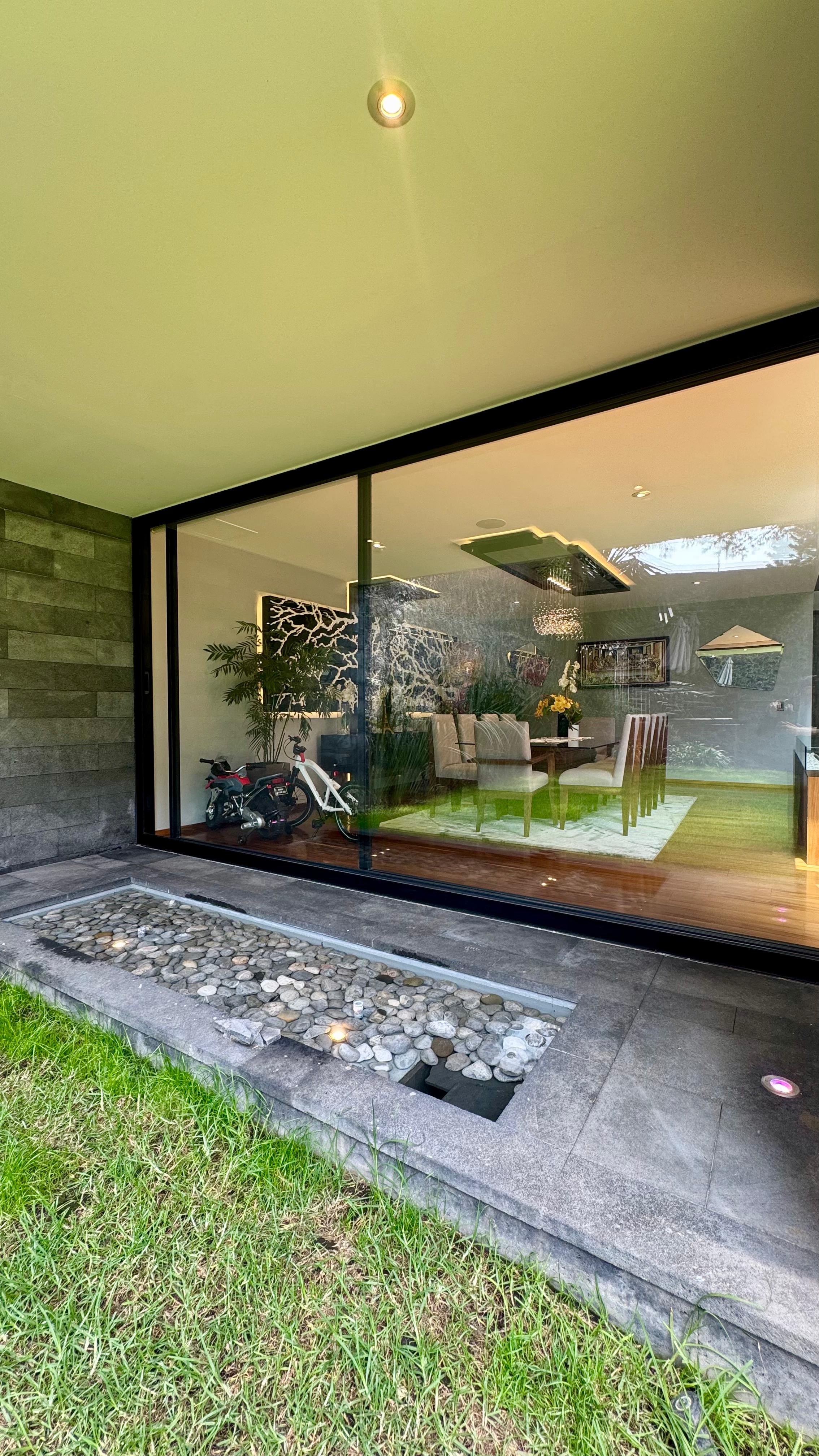 Vidrios templados en sala, comedor, cocina y fijos en planta alta y baja.