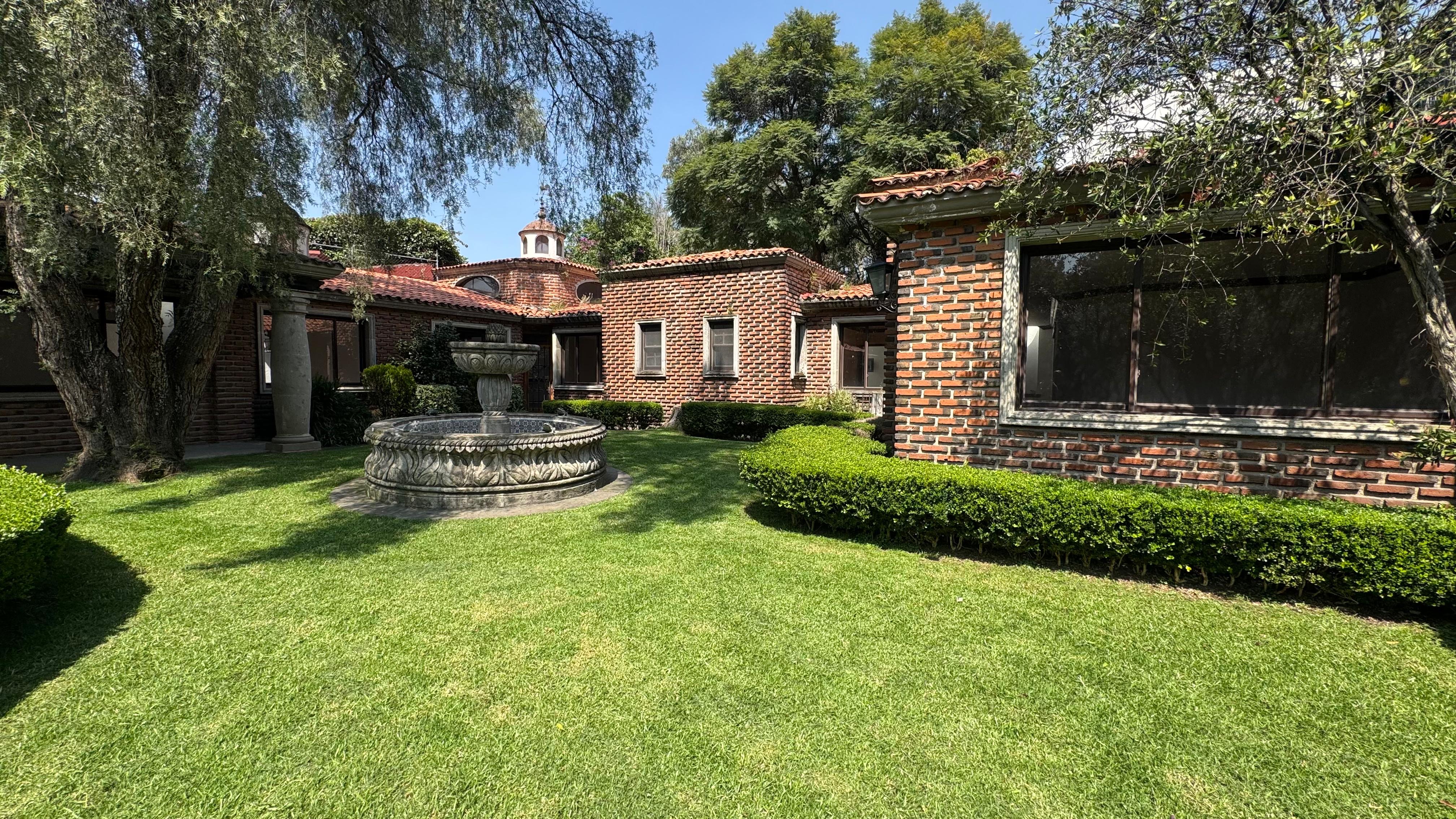 Amplio jardín con fuente de cantera.