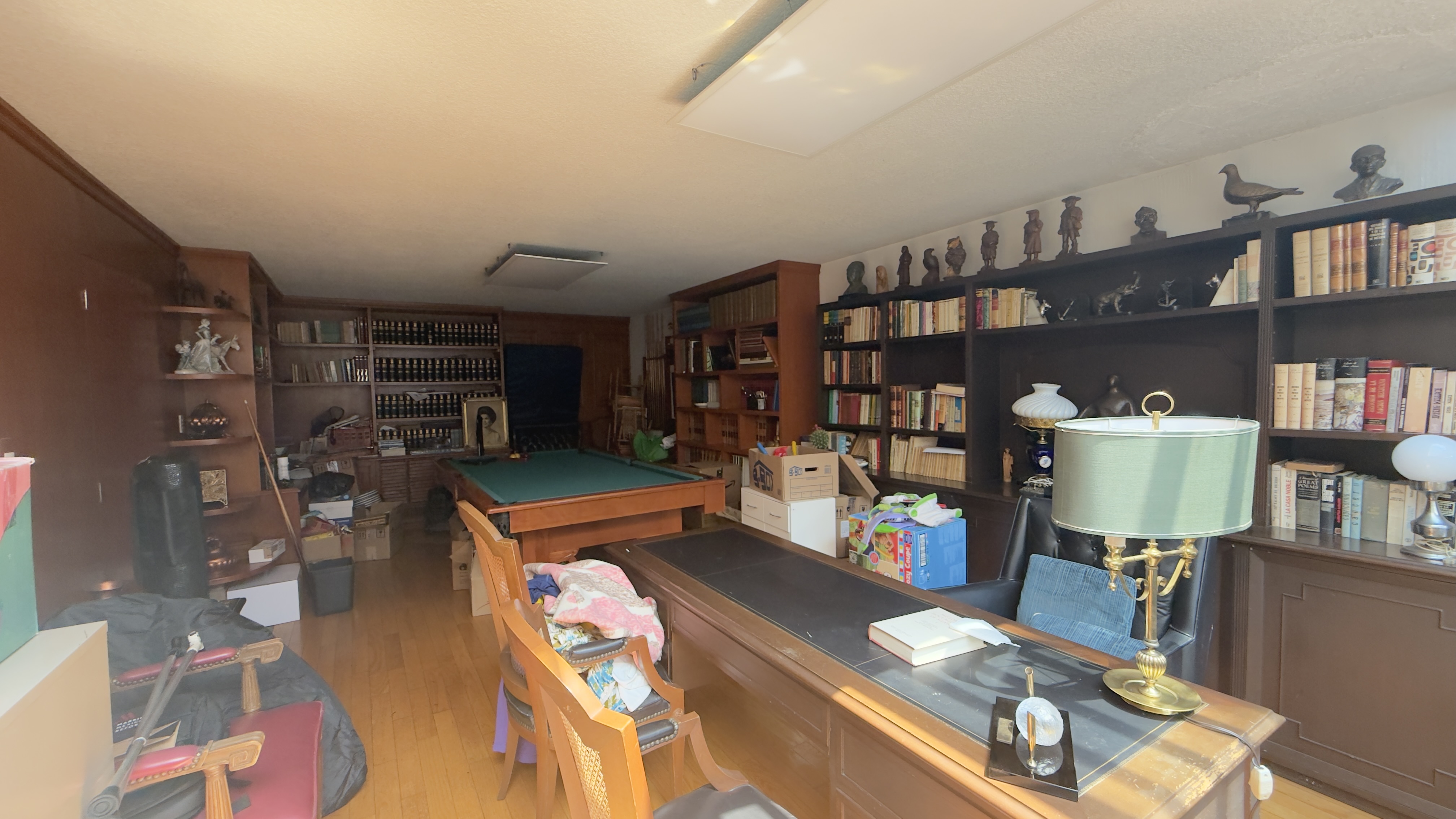 Estudio con muebles empotrados de madera con área para juegos.