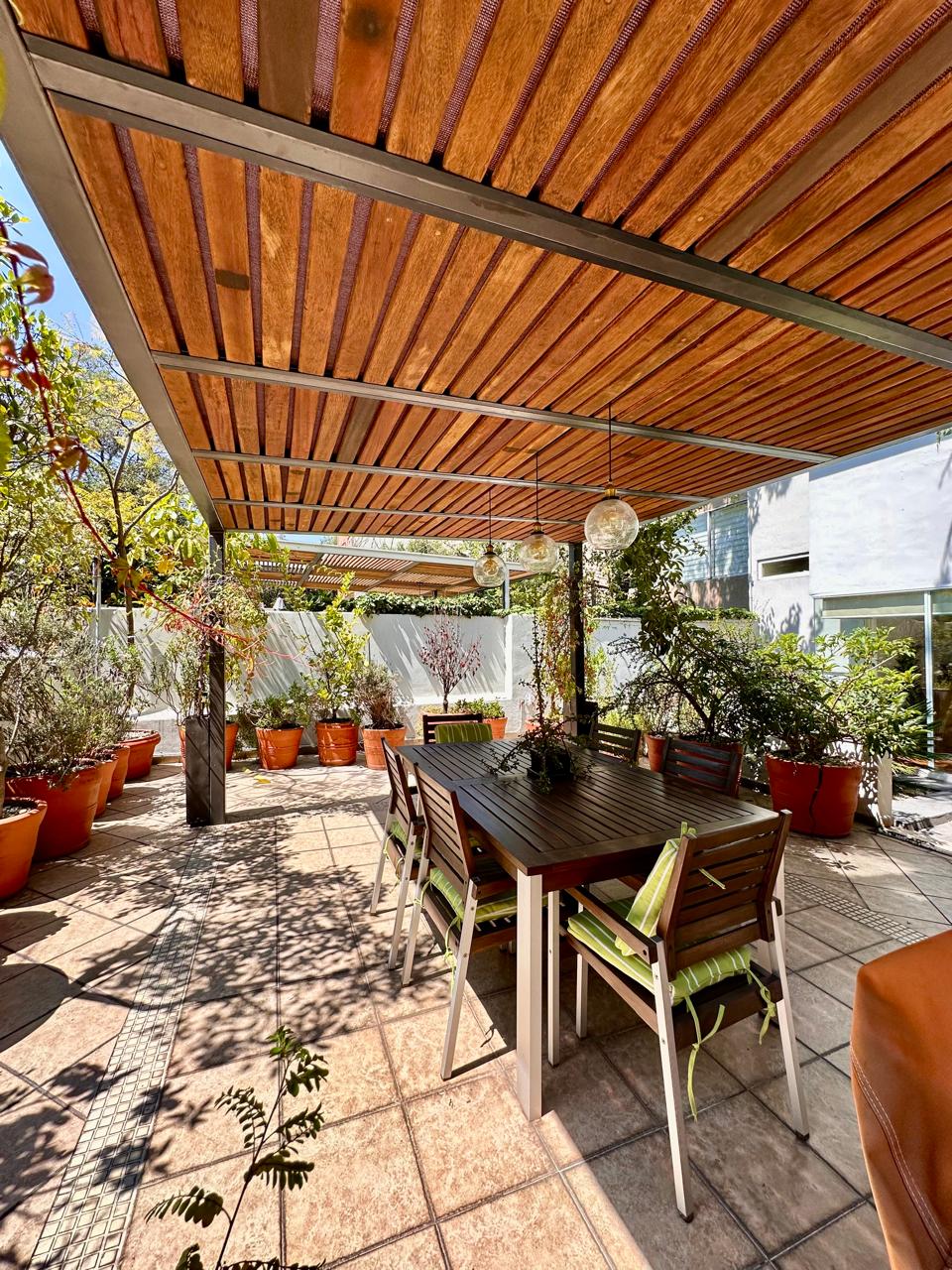 Estancia Sala comedor con pisos de madera, luz natural y salida a una hermosa terraza de 50 m2 aproximadamente, con pérgola, espacio para asador y una linda vista arbolada, donde podrás recibir a tus familiares y amigos.