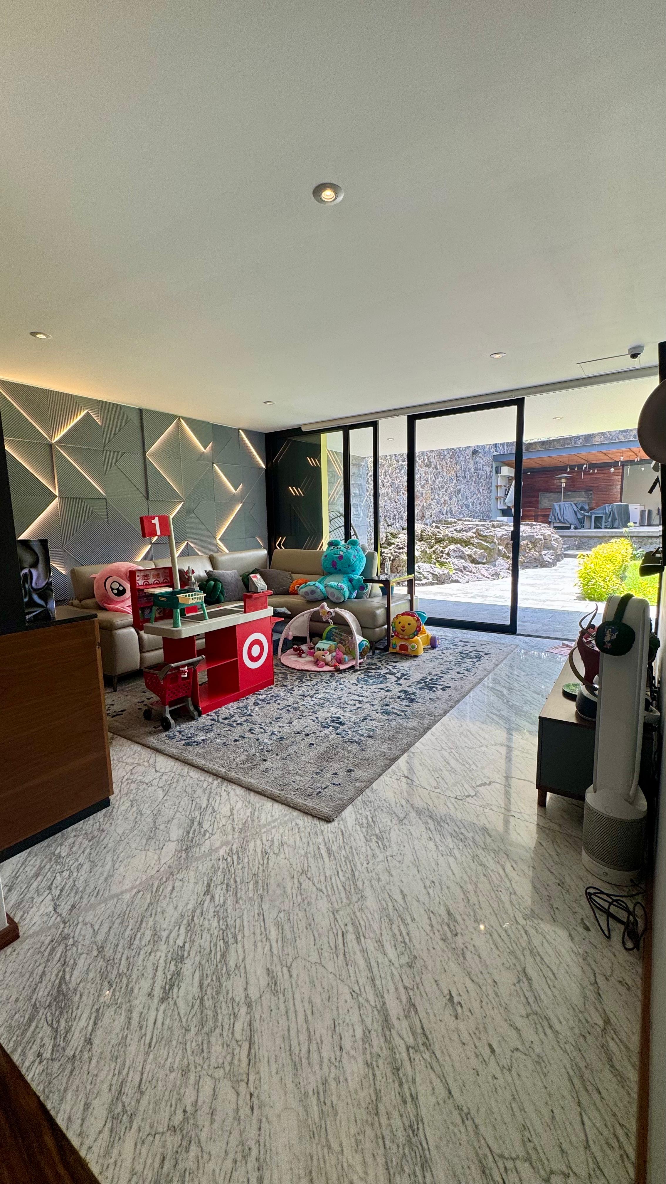 Family room con bar de gran tamaño con salida a terraza.