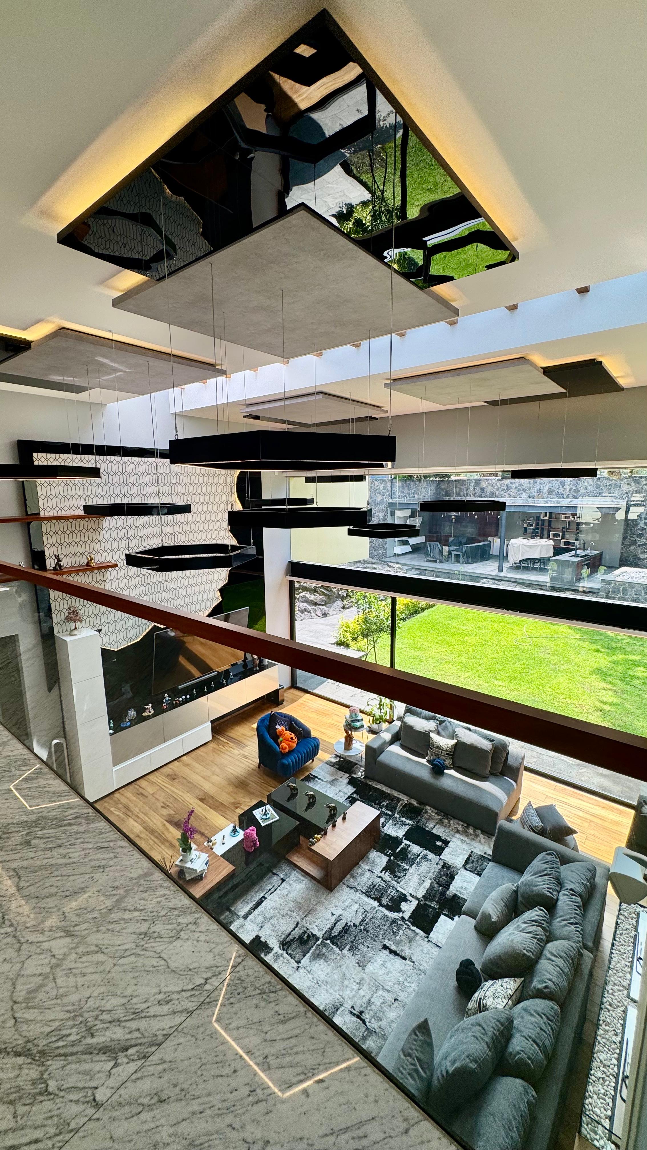 Vidrios templados en sala, comedor, cocina y fijos en planta alta y baja.