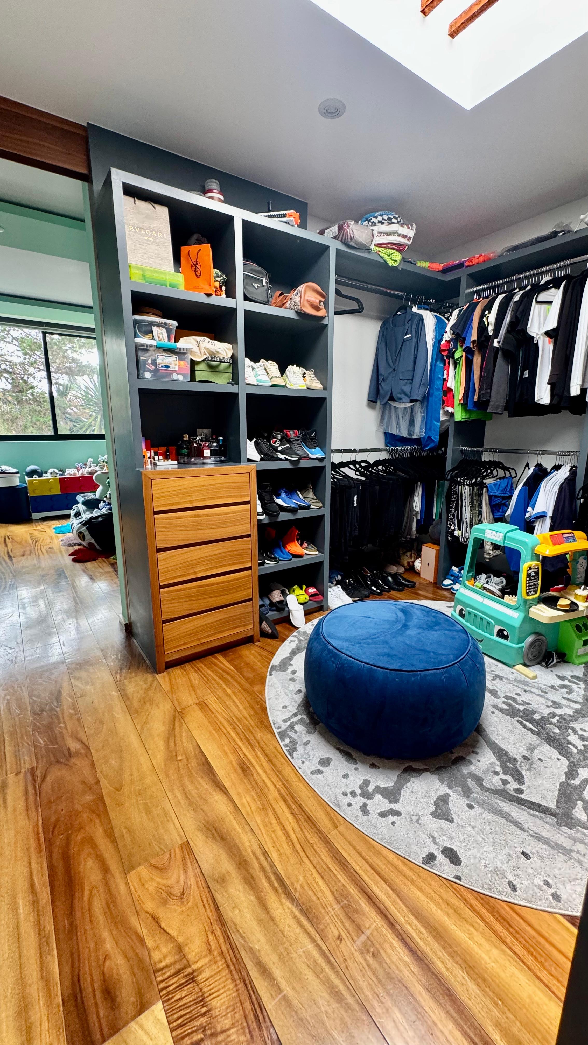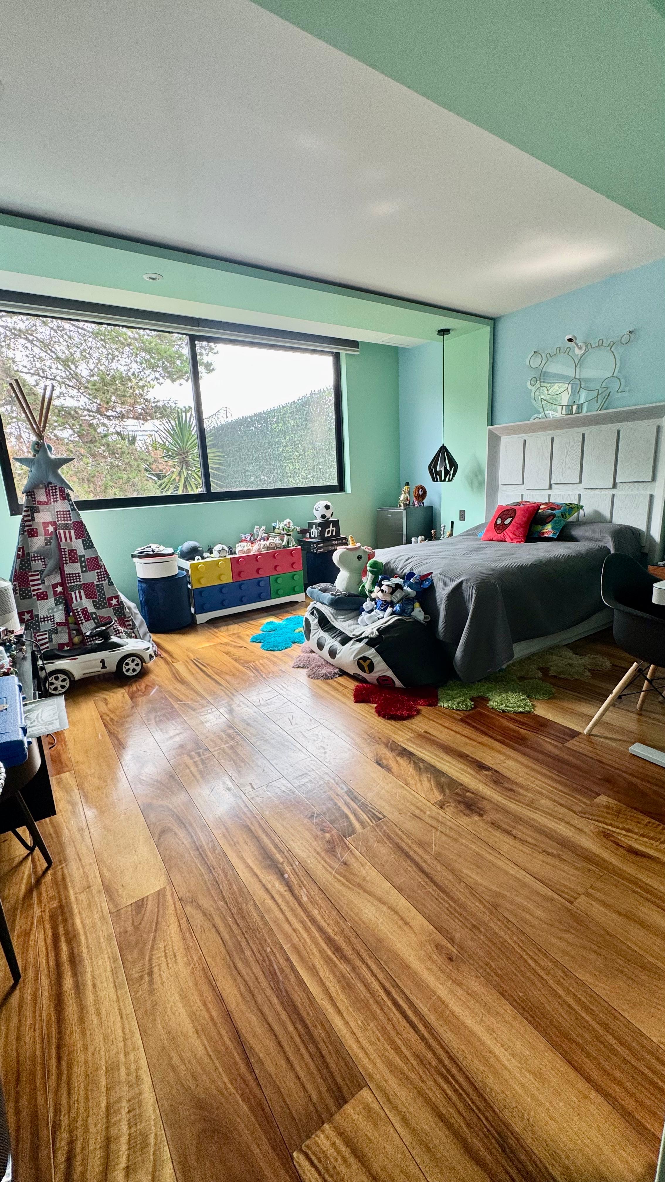 Recámara principal con vista al jardín, baño con doble lavabo, vestidor de gran tamaño con isla al centro.