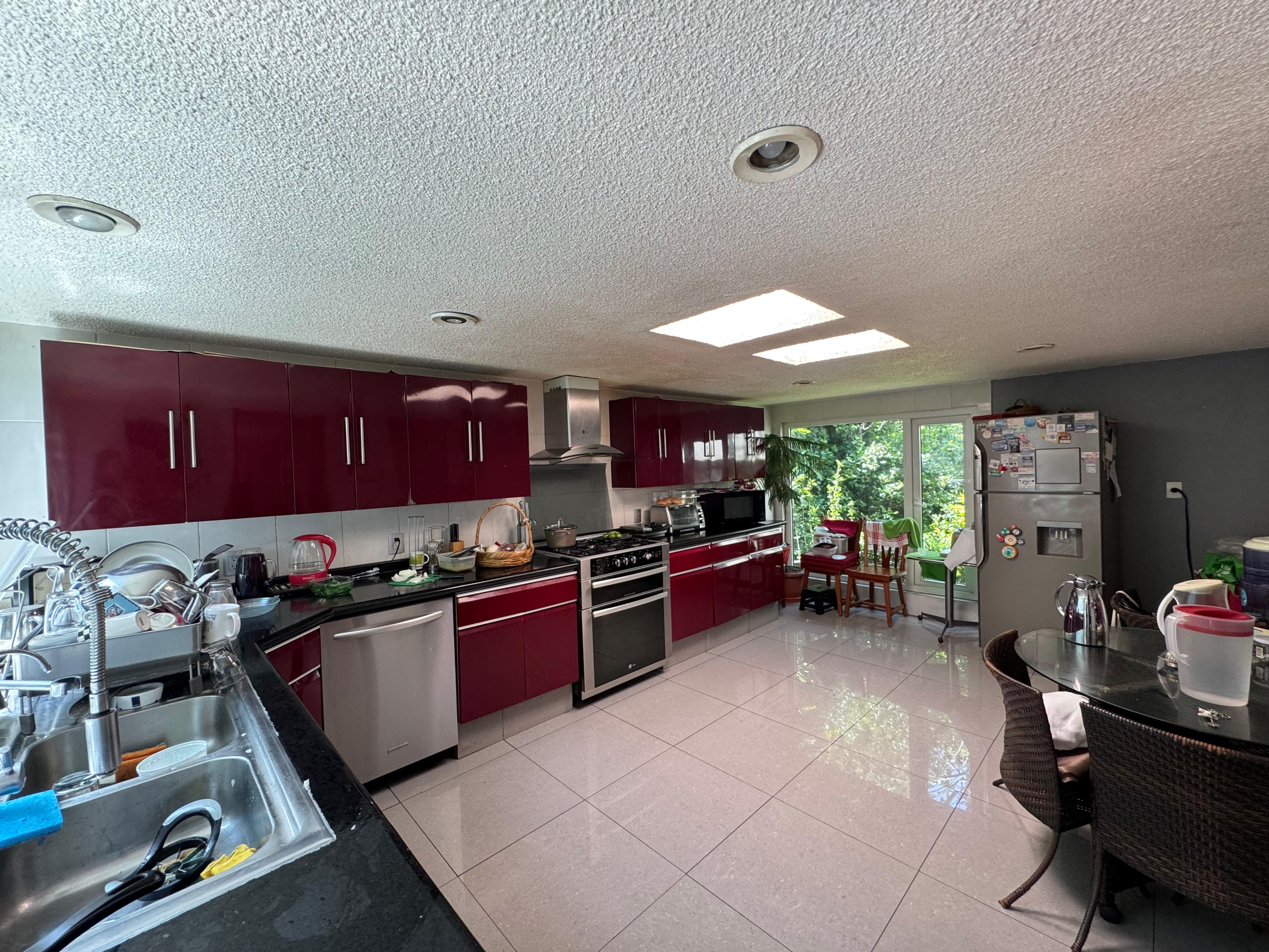 Cocina de gran tamaño equipada con estufa, campana y lavavajillas con espacio para desayunador, seguidor por un amplio ante comedor.