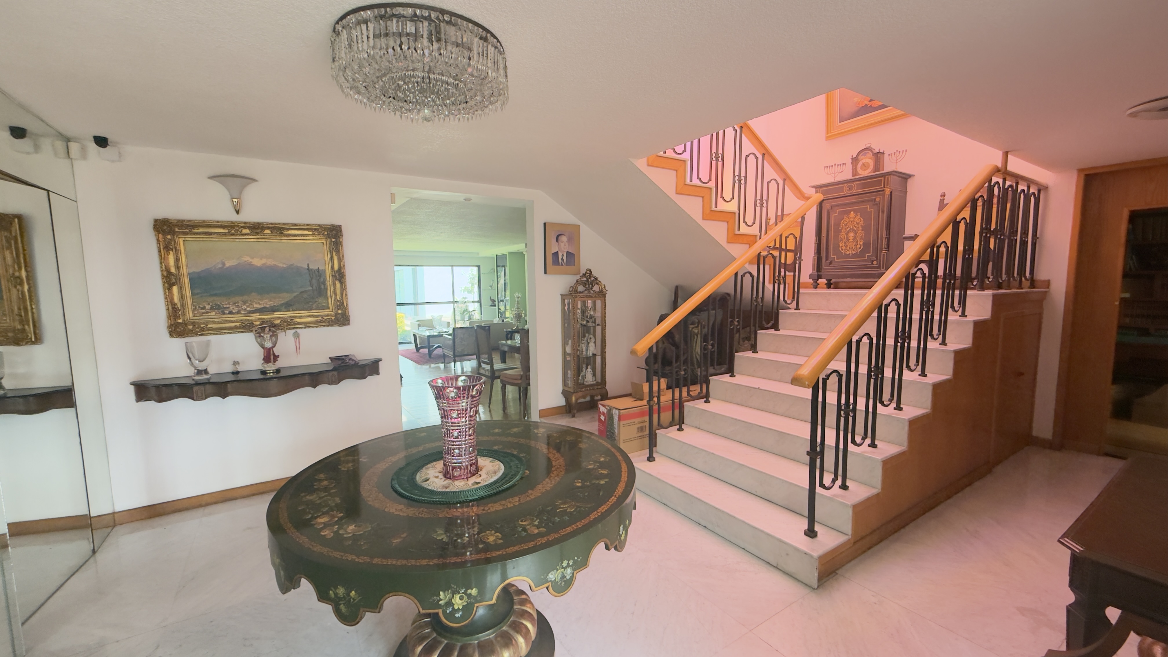 Amplio recibidor muy iluminado con techos de mediana altura.