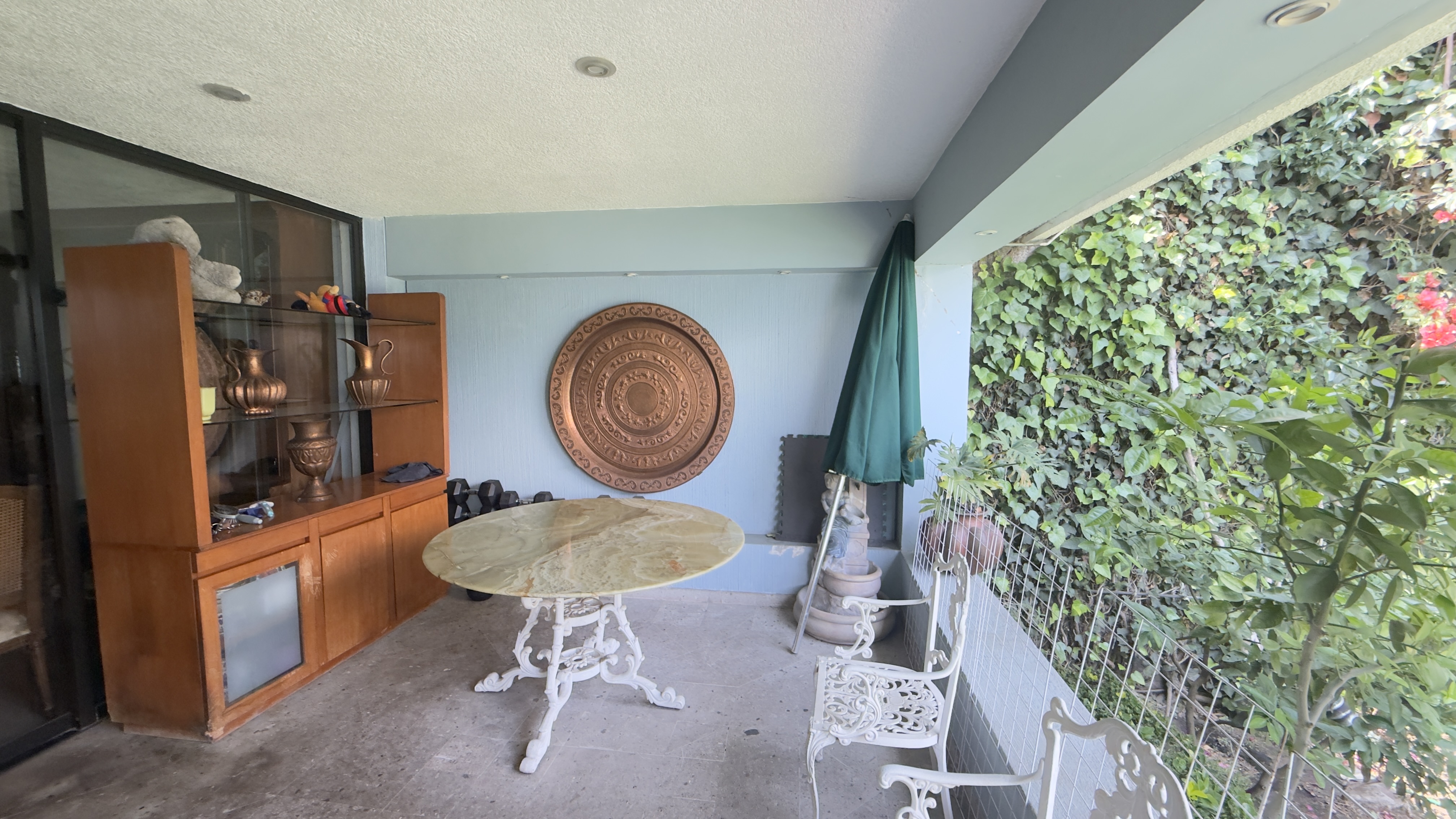 Antecomedor con cuarto para vajillas y salida a la terraza que se integra al jardín de la propiedad.